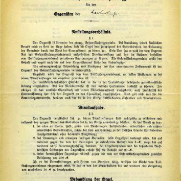 Vom Verwaltungsausschuß und engeren Rat wurde eine Dienstanweisung für die Organisten ausgearbeitet; dieselbe wird dem KGR bekannt gegeben. Bei der Besprechung war von einem Antrag wegen Orgelspiels an den Sonntagnachmittagstaufen Abstand genommen. Der für Organist Keller bisher durch Privatzeichnungen aufgebrachte jährl. Gehaltszuschlag von 700 M. ist vom nächsten Jahr ab nicht mehr zu zahlen. Da jedoch noch die Mittel für 1 Jahresrate vorhanden sind, beschließt der KGR: