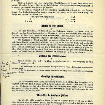 Der Vors. gibt verschiedene Beschlüsse des Eng. Rats betr. Kündigung, Wiederanstellung u. Dienstanweisung der Organisten bekannt im Zusammenhang mit einer Darlegung der Folgen für die Organistenfrage an unserer Kirche. Während die meisten hiesigen Gemeinden für die Organistenkosten selber aufzukommen haben, bleibt außer der Stiftskirche auch die unsrige von der Neuregelung unberührt; jedoch muß bei Weiterbenutzung der Orgel zu den Neben- und Jugendgottesdiensten sowohl für Orgelgebrauch als auch für den Organisten eine entsprechende Entschädigung an die Gesamtgemeinde entrichtet werden. Hierüber hat der KGR Beschluß zu fassen. Nach eingehender Erläuterung durch den Vors. u. reger Aussprache wird beschlossen:
